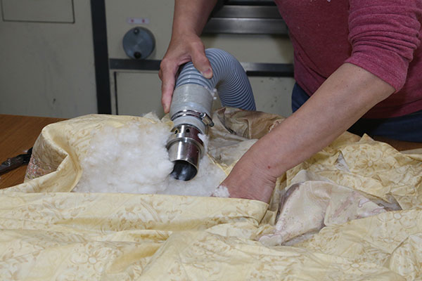 新しい側地に羽毛を規定量吹き込んでいきます。砕けて減ってしまった羽毛分の足し羽毛はホワイトグースの90/10(ダウン90/フェザー10)の高品質です。